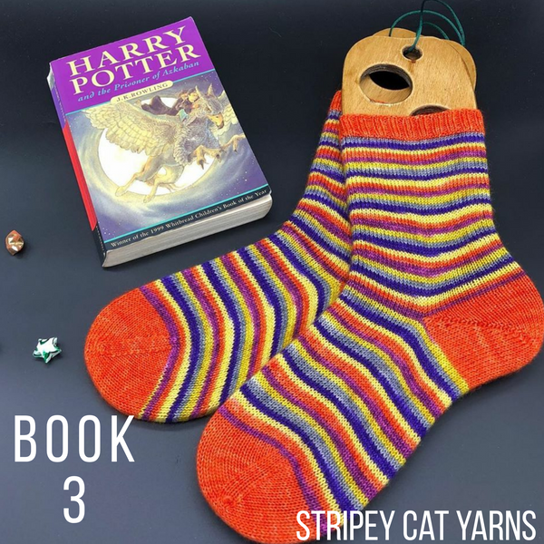 Book 3 is inspired by the cover of HP & the Prisoner of Azkaban. It is a self striping sock yarn which stripes as follows when you knit;